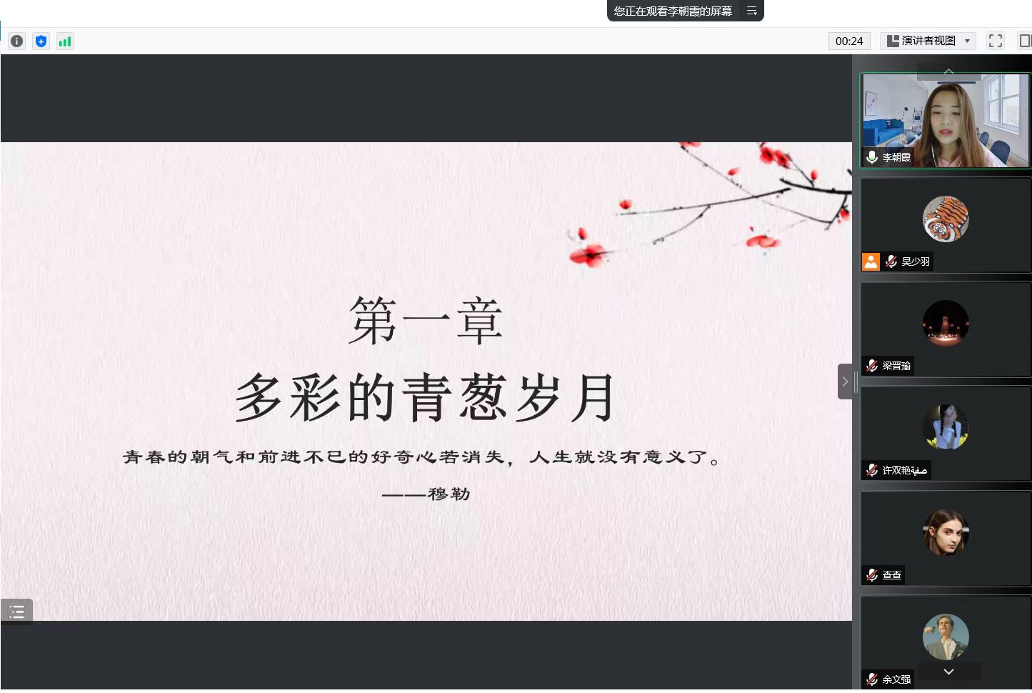 李老师用精炼简短、轻松愉快的言语将同学们带入今天的主题。青葱岁月单纯、懵懂、美好。大学的时光像烟花一样美好却又转瞬即逝。她告诫同学们要抓住大学时光,好好学习,好好生活,感受青春的朝气和蓬勃。随后,李老师为同学们讲述了她在俄罗斯游学的有趣经历。在不耽误学业的情况下,设身处地的感受当地人土风情,让大家都向往不已。李老师回校工作后,不停的吸收新知识,充实自我,即使在工作繁忙的情况下,仍然坚持读书,在放松心情的同时也能拓宽自己的眼界和格局。