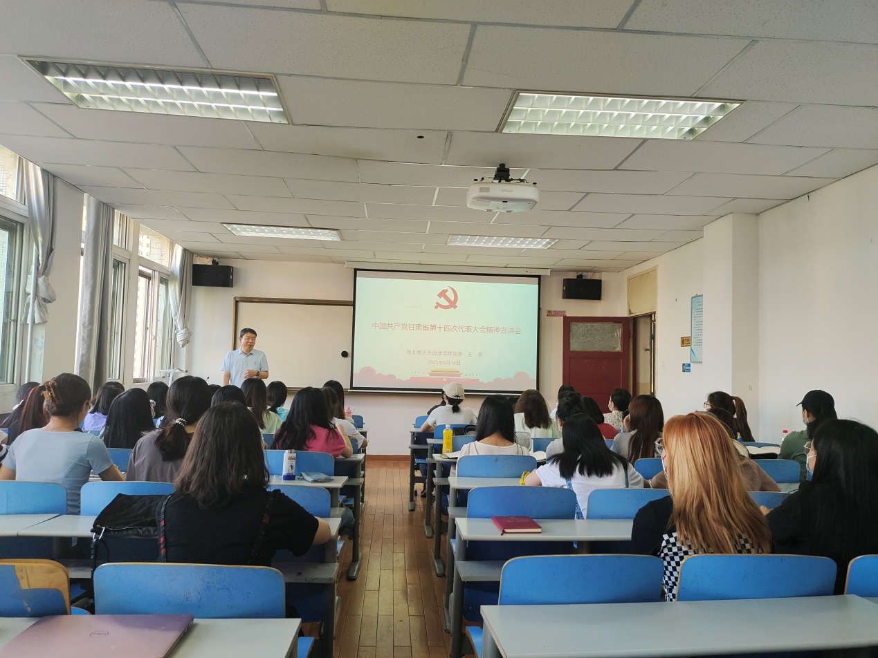 为深入学习贯彻甘肃省第十四次党代会精神,统一思想,凝聚力量,6月14日晚,yl6809永利本科生第二党支部在教学三号楼709教室召开“学习贯彻省第十四次党代会精神,凝心聚力奋进新征程、建功新时代”主题党日活动,邀请yl6809永利党委书记王景为支部全体党员宣讲甘肃省第十四次党代会精神。
