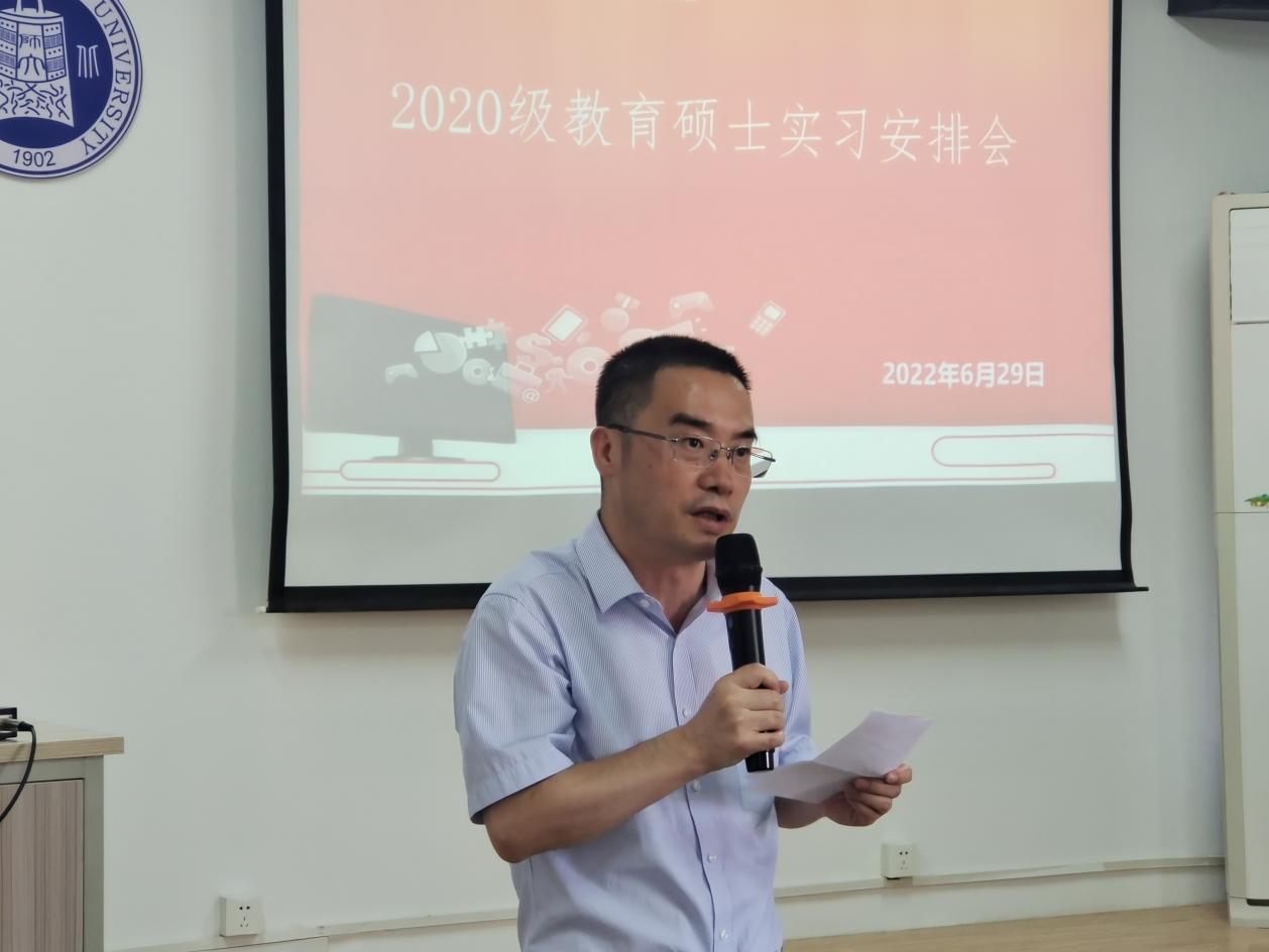 2022年6月29日下午,yl6809永利在教学3号楼806教室召开2020级教育硕士实习工作安排会,学院副院长高育松教授出席,教育硕士管理中心主任钟莉婷、副主任黄彩霞及2020级全体学科教学(英语)教育硕士参会。