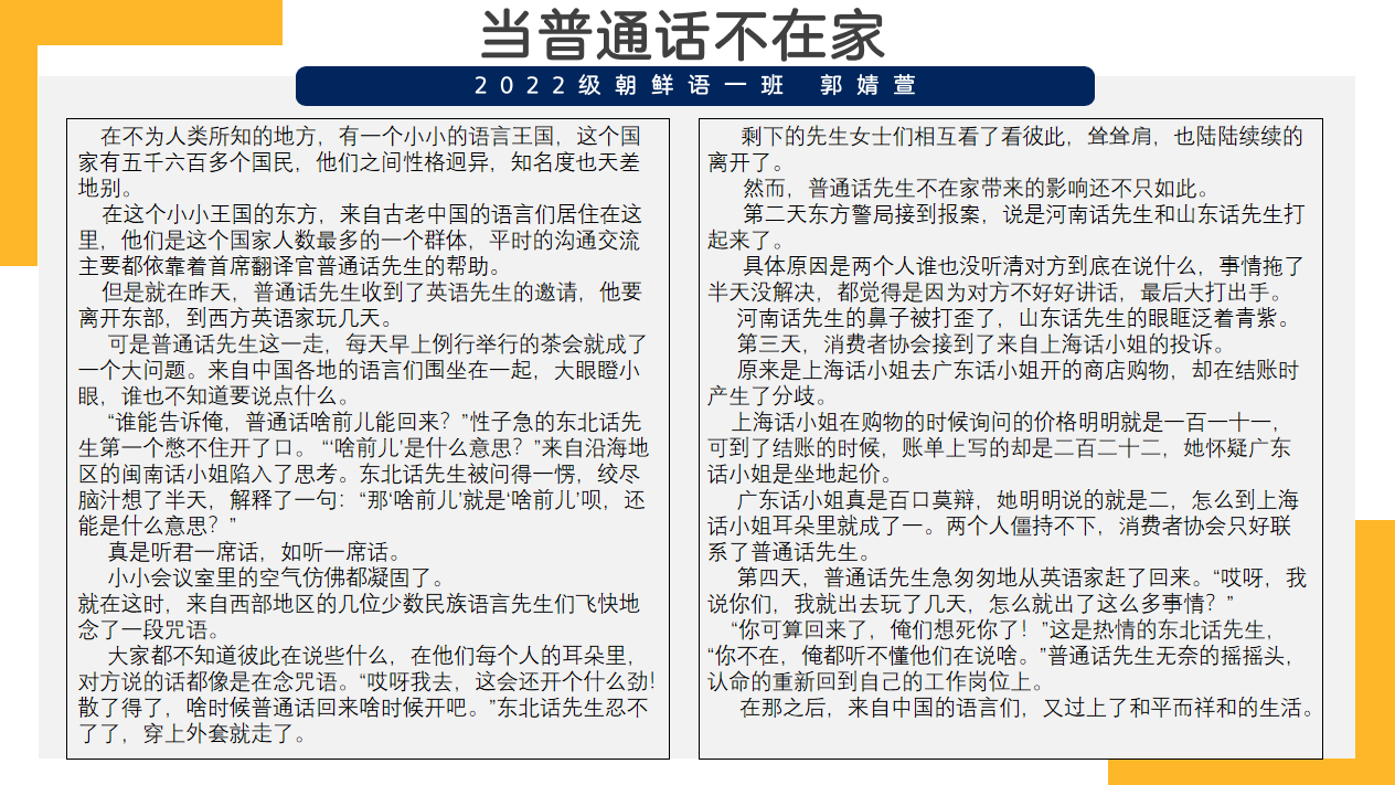 2022级朝鲜语一班郭婧萱(校园文学作品《当普通话不在家》):“作品里东北话的戏份较多,会更加努力练习普通话。”