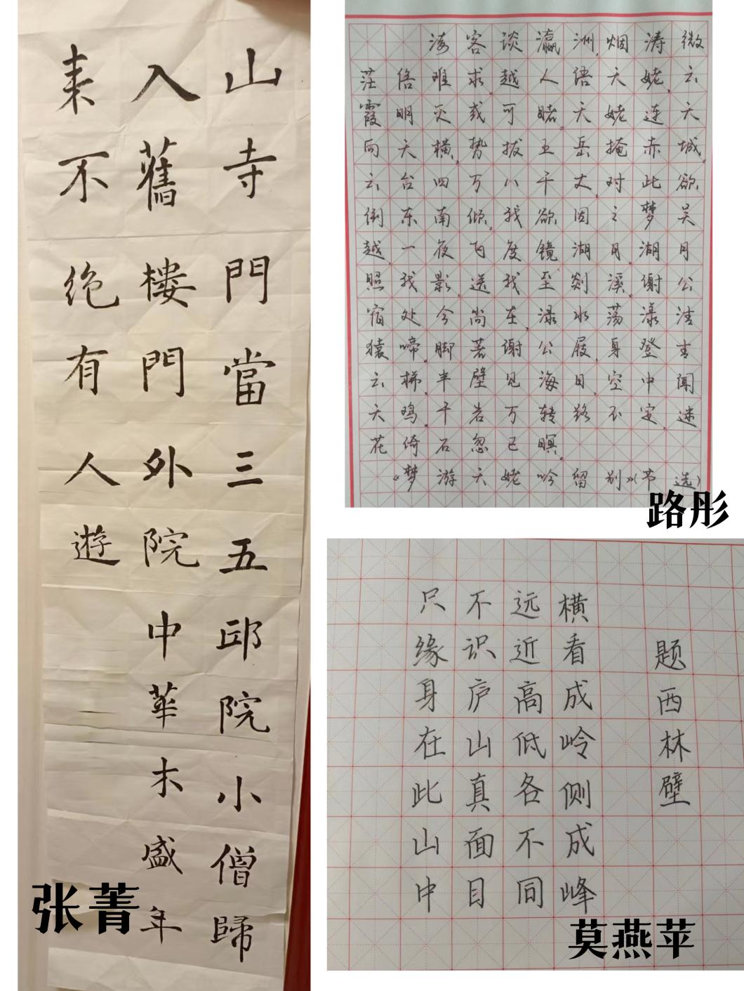 2022级朝鲜语一班张菁(软笔书法书法作品):“用规范字来规范自己。”路彤(硬笔书法作品):“虽然经过多次失败才完成了作品,但是这让我更加认识到了写好规范字的重要性,以后也会继续坚持下去。”莫燕苹(硬笔书法作品-题西林壁):“练习书法是一个长期的过程,求精求勤求不停止。练习书法不是将一个字写上千遍,而是观摩它,感知他的结构,再学习它。练习书法、写规范字,是培养自我的一个过程。”