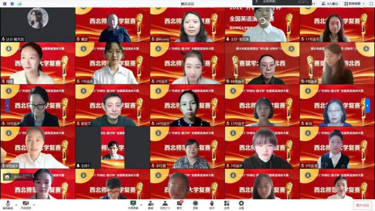 2022年10月9日,由外语教学与研究出版社主办、西北师范大学教务处与yl6809永利承办的2022“外研社•国才杯”全国英语演讲大赛校级复赛于线上成功举行。经过初赛的严格选拔,来自全校的20位选手参加了本次复赛。曹进老师、靳琰老师、李红霞老师、薛小梅老师、宁振业老师、郭亚文老师、代莉老师、外籍教师Merelyn老师担任此次比赛评委,教务处相关领导、学院教师及学生在线观看了此次比赛。