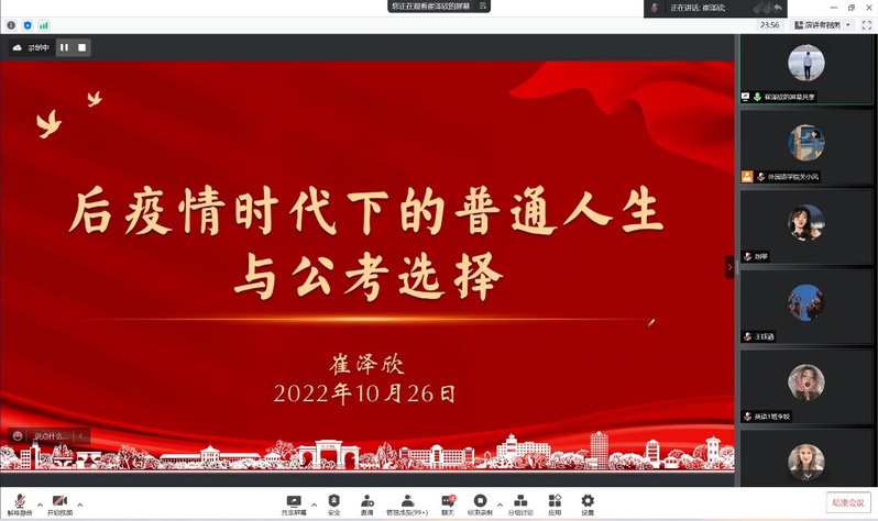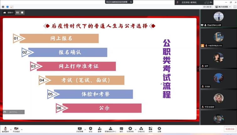 分享会上,崔泽欣同学主要从两部分展开分享。第一部分结合当前疫情形势和自身经历,从正心、明道、取势、优书四方面鼓励大家正视自己的内心,关注时事政治,通过积极参加活动提升自身软技能。第二部分他从公考选择入手,着重讲解了公务员考取的工作流程及注意事项,帮助同学们了解公务员考试的相关事宜。同时,他就公务员的定义、职位以及国考和省考的区别给同学们做了详细的分享,鼓励同学们只有肯下苦功才能在求职时自信地展示自我。最后,他用“道阻且长,行则将至;行而不至,未来可期”的至理名言作总结,勉励同学们在未来求职的道路上,不为任何风险所惧,不为任何杂音所惑,以更加坚定的信心和举措面对挑战,成就自我。