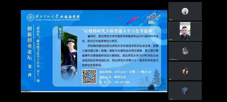 为帮助yl6809永利学生更好的规划职业生涯,提升求职就业技能,10月26日晚,yl6809永利举办“创新创业论坛”暨“指南针”就业能力提升工作坊系列活动。本期邀请到2021届俄语专业本科优秀毕业生崔泽欣,为同学们带来精彩的“后疫情时代下的普通人生与公考选择”主题分享,yl6809永利专职辅导员张碧全老师主持,近300名同学线上参与讲座。