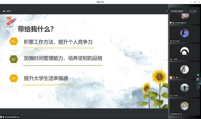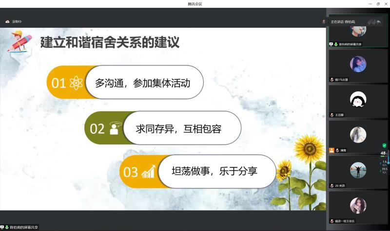 分享人陈怡莉从学习、实践、志愿活动、宿舍关系等四个方面展开分享。在学习篇,她将学习比作地基,提醒同学们要认真学习专业知识,打好“地基”,同时要能够通过积极参加专业竞赛来提升自己,鼓励同学们不要因为害怕失败而错失良机;在实践篇,她结合个人在担任班级团支书、担任辅导员、学生党支部宣传委员、研究生班长等经历,鼓励同学们抓住各类机会积累工作经验、提高沟通能力、培养坚韧性格;在志愿活动参与的分享中,陈怡莉通过分享自己丰富多彩的志愿活动经历鼓励同学们通过参与志愿服务活动丰富大学生活,为步入社会奠定经验基础;在宿舍关系的篇章中,她结合与本科舍友、研究生舍友的相处之道,谈到好的宿舍关系是心理调节的良剂,也是迈向社会生活的“试金石”,同学们有矛盾要及时沟通、及早调节,要怀一颗容人之心,学会坦荡做事,乐于分享。