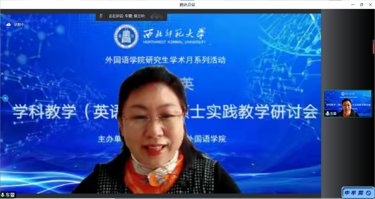 西北师大附中英语学科高级教师吴岩菁以“中学英语教师核心素养”为题,对英语教师应如何塑造及提高自身教学素养进行了经验分享。吴老师表示,英语教师的语言能力非常重要,教师只有注重自身语言素养的提升,不断学习、更新知识,才能做好学生的引路人。本场主旨发言由蔡兰珍教授主持。