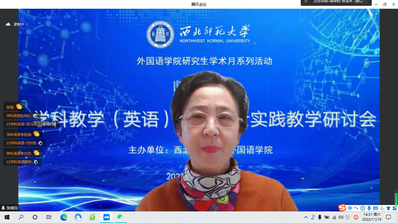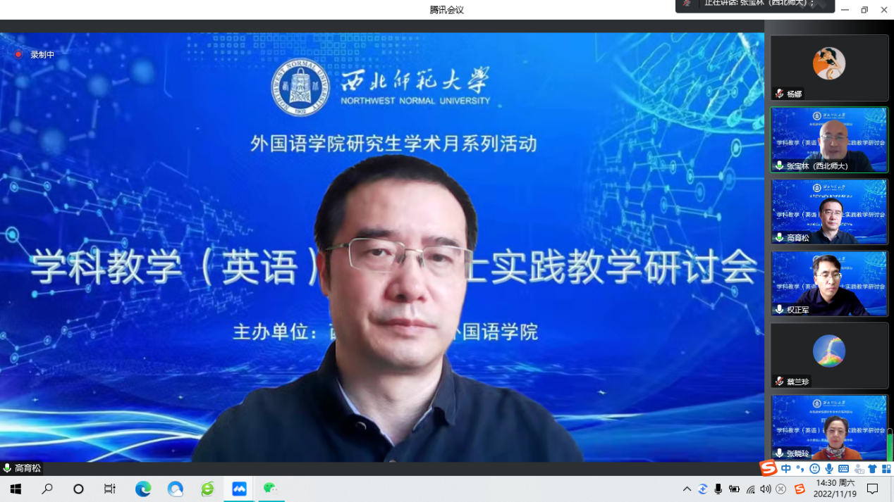 为全面提升研究生的专业能力和综合素养,以实际行动迎接我校120周年校庆,我院于2022年11月19日举办以“创新实践教学模式、培养卓越外语师资”为主题的“师苑撷英·学科教育(英语)教育硕士实践教学研讨会”。本次研讨会是我院校庆系列活动和研究生学术月系列活动的重要组成部分。西北师范大学研究生院院长权正军教授、yl6809永利院长高育松教授出席开幕式并讲话,张晓玲等6位长期奋战在中学英语教育一线的我院优秀校友应邀做了主旨发言。我院近300名研究生及导师参会。