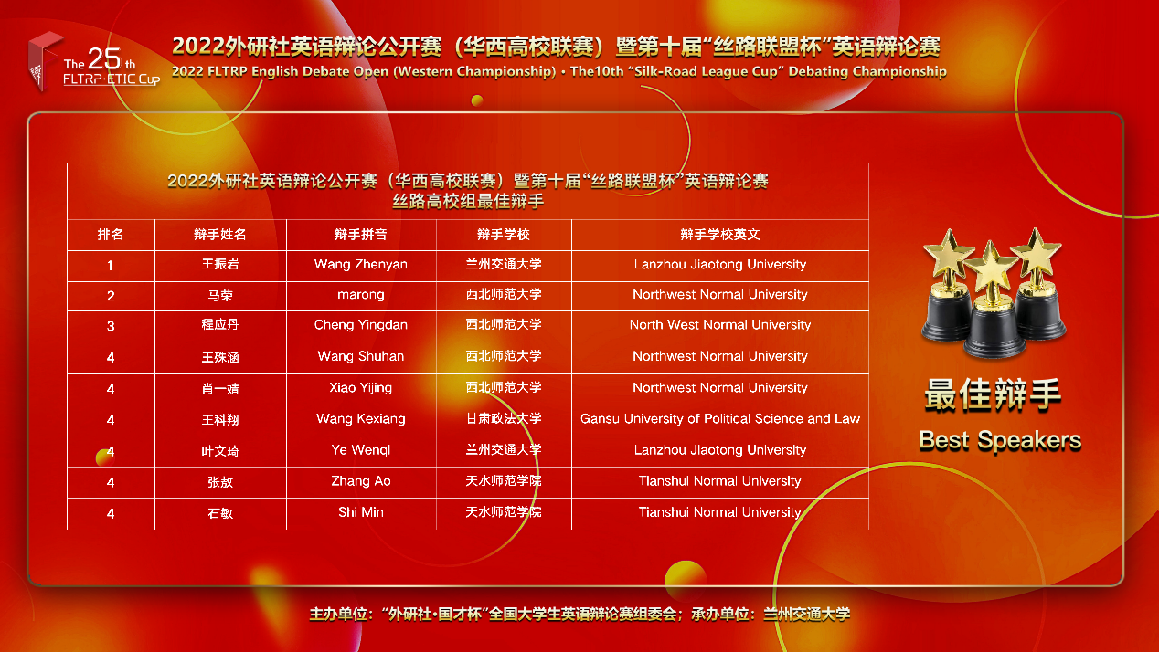 2022年11月19日-20日第25届“2022外研社英语辩论公开赛(华西高校联赛)暨第十届“丝路联盟杯”英语辩论赛由兰州交通大学承办,并在线上举行。来自全国各个高校,124支队伍经过两天共5轮循环淘汰赛以及半决赛和决赛,最终使比赛圆满落下帷幕。