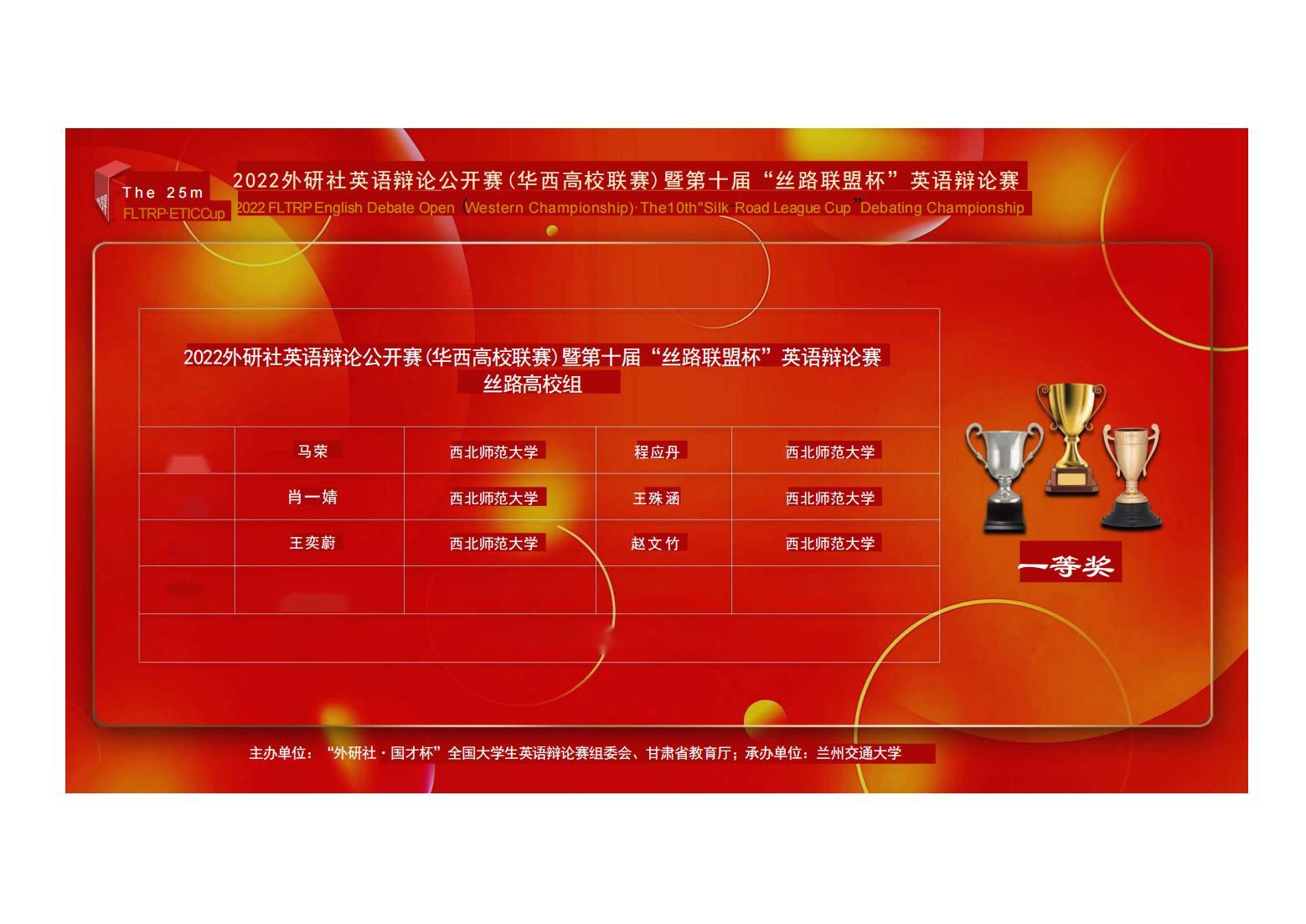 本次比赛,以英语辩论为契机,在指导老师的悉心指导之下,选手们通过精彩的比赛和优异的成绩,向全国展示了师大学子的灵活性、创新型、多样性以及思辨能力和综合表达能力。本次比赛,yl6809永利共派出5支参赛队伍,由英语系王奕蔚、马荣、肖一婧、王姝涵;翻译系陈娟、李瑾若、张艺馨、贺爱丽;MTI专业赵文竹、程应丹组成。最终,yl6809永利马荣、程应丹、肖一婧、王姝涵、王奕蔚、赵文竹获得2022外研社英语辩论公开赛(华西高校联赛)暨第十届“丝路联盟杯”英语辩论赛一等奖,陈娟、李瑾若、张艺馨、贺爱丽获得2022外研社英语辩论公开赛(华西高校联赛)暨第十届“丝路联盟杯”英语辩论赛三等奖。其中马荣、程应丹、王姝涵、肖一婧、获得大赛“优秀辩手”称号。