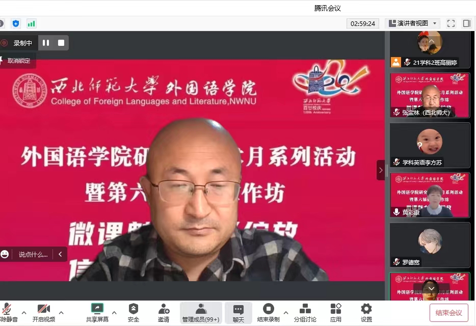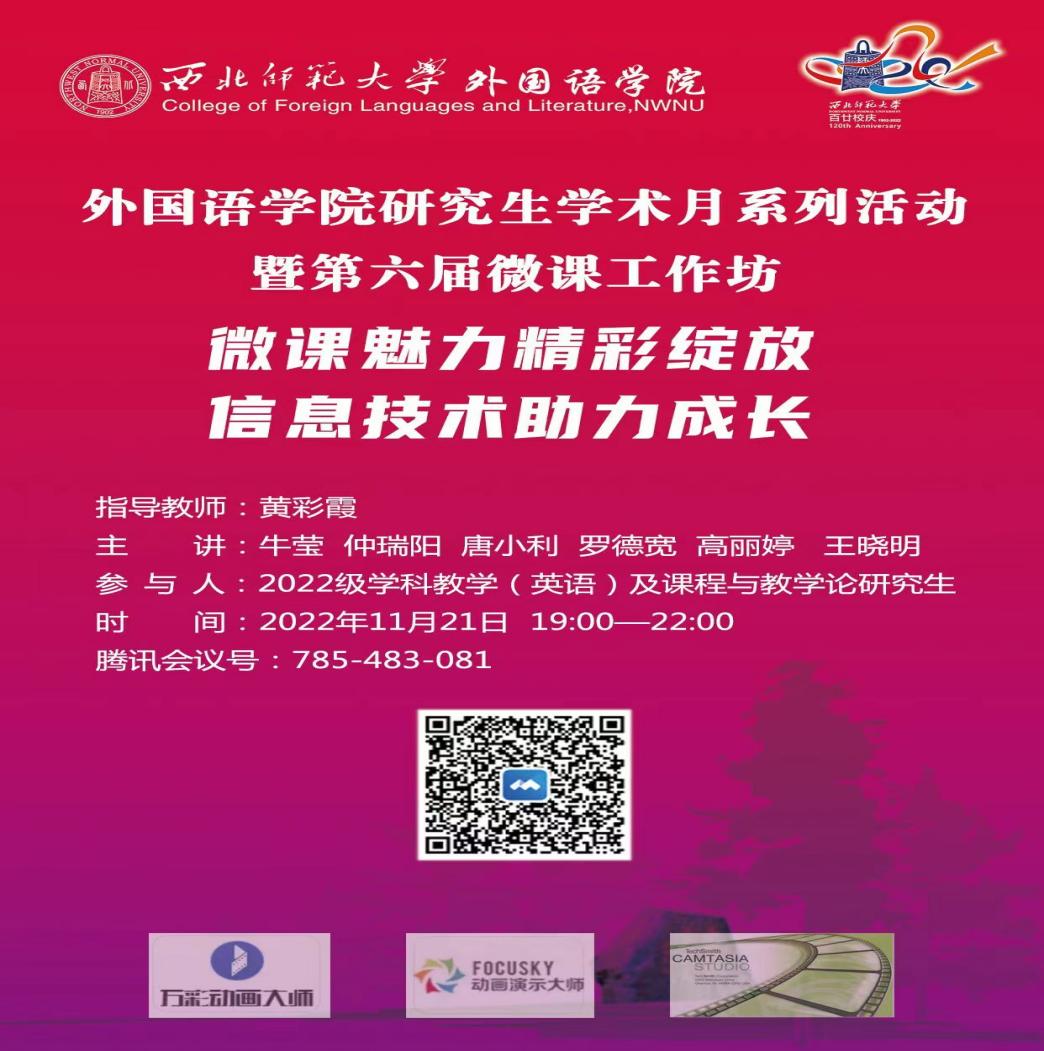 2022 年11月21 日晚,yl6809永利研究生学术月系列活动暨第六届“微课工作坊”在线上开展。本届工作坊以“微课魅力精彩绽放,信息技术助力成长”为主题,2021 级学科教学(英语)专业研究生仲瑞阳、唐小利、牛莹、罗德宽、高丽婷、王晓明等6位同学组成的团队担任主讲,黄彩霞老师全程指导。2022 级学科教学(英语)教育硕士和课程与教学论研究生、农村教育硕士、非全日制研究生约180 人参加了本次活动。