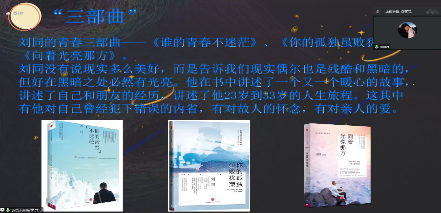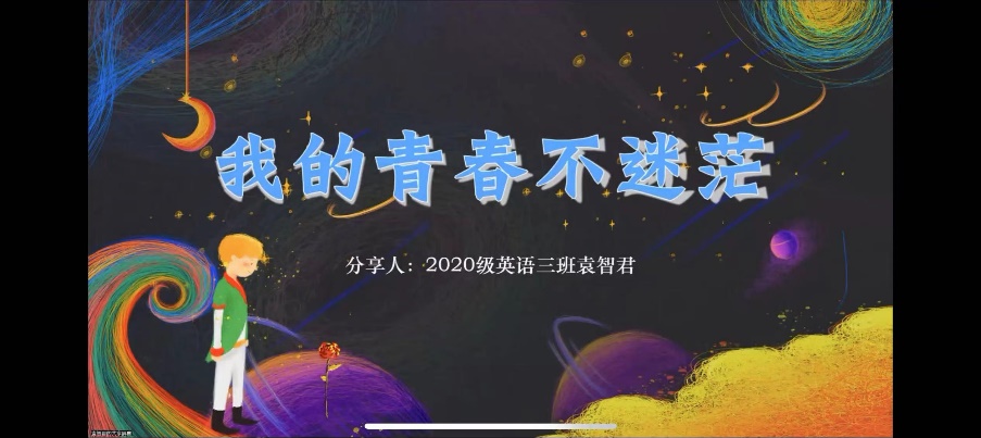 首先,2020级英语专业袁智君以“相遇、相知、相识”三题为引,以照片为线,展示西北师范大学丰富多彩的社团活动。同时,袁智君向同学们推荐书籍刘同“三部曲”--《谁的青春不迷茫》、《你的孤独虽败犹荣》、《向着光亮方向》,他分享到“凡事总有过去的时候,回头看劫后余生的自己,原来万物皆有裂痕,那是光照进来的地方”,正如这句话所说,在我们的人生中总会经历许多磨难,但只要挺过去,便会发现所经历的磨难都变成了照亮人生的盏盏明灯。