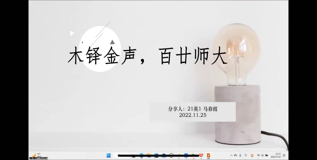 随后,2021级英语专业马春霞以“木铎金声,百廿师大”为题,带领同学们从“云端”参观学校博物馆。接着马春霞为同学推荐书本《平凡的世界》,提到这部小说所传达出的精神内涵,正是对中华民族千百年来自强不息、厚德载物精神的自觉继承。书中刻画了社会各阶层众多普通人的形象,虽然“我是一个平凡人,但平凡的人,也可以过得不平凡”,希望能把这本书中的力量传递给每一个同学。