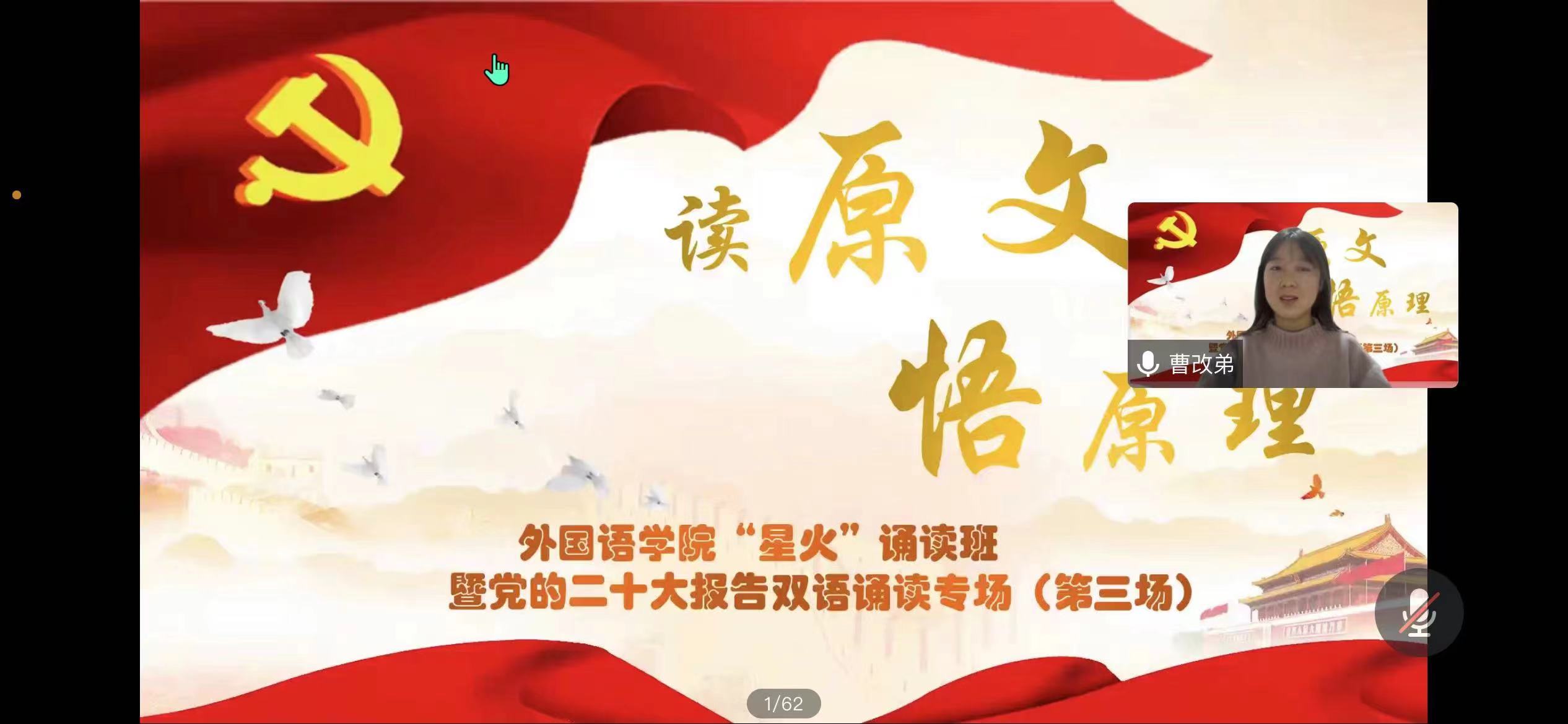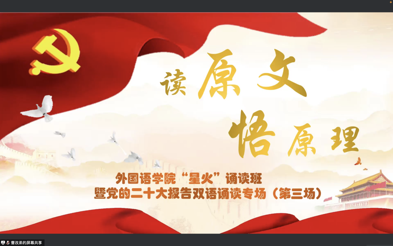 诵读活动在刘宁老师的主持下开始。首先,本科生代表、2020级英语专业曹改弟、王殊涵对党的二十大报告选段进行了双语诵读。