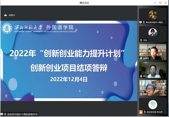 12月4日晚,yl6809永利举办2022年“创新创业能力提升计划”创新创业项目结项答辩,共有10个项目组参与答辩。答辩邀请到英语系靳洁老师、翻译系崔挺老师、专职辅导员张碧全老师担任评委。各项目组成员线上观摩学习。