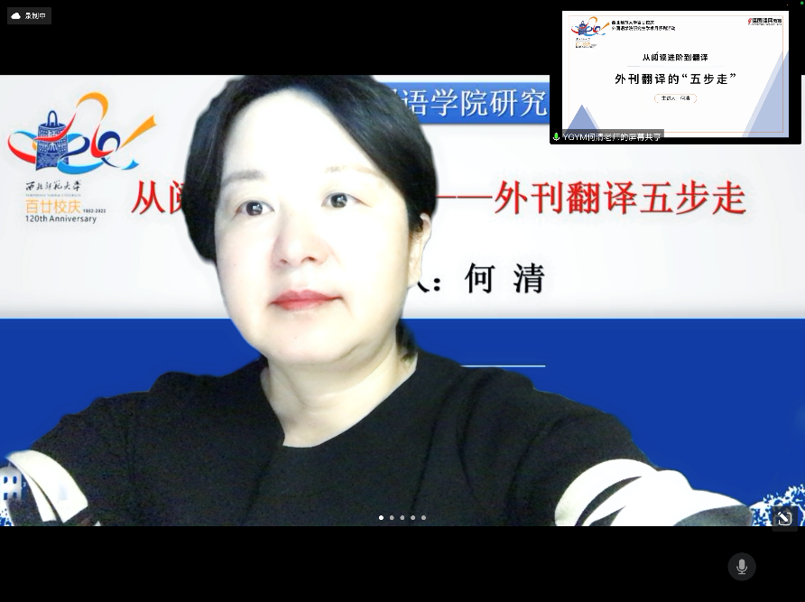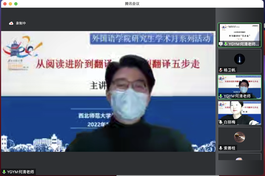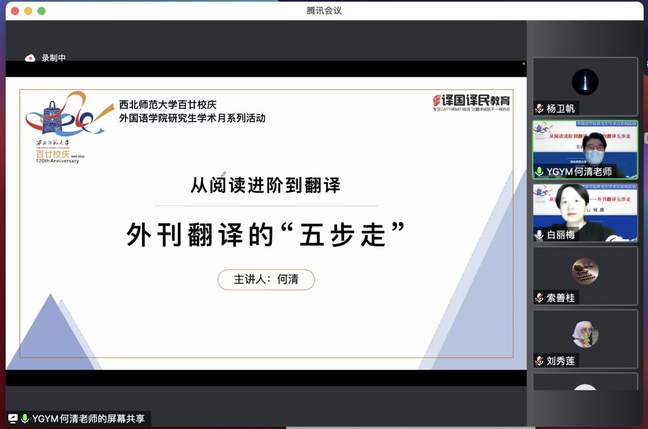 为帮助我院全体翻译硕士提升专业素质,增强实战能力,2022年12月15日晚,yl6809永利特邀译国译民集团讲师何清作了题为“从阅读进阶到翻译——外刊翻译五步走”的线上分享会。会议由yl6809永利MTI中心主任白丽梅教授主持,2021级和2022级全体翻译硕士参与聆听。