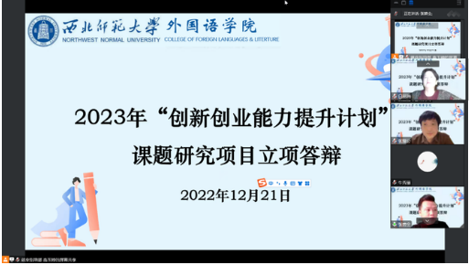 为培养学生创新思维、提高学生学术研究能力,2022年12月21日晚,yl6809永利线上举行2023年“创新创业能力提升计划”课题研究项目、劳动育人实践项目立项答辩会。本次答辩邀请到英语系白丽梅老师、俄语系牛秀丽老师、朝鲜语系张耀公老师、专职辅导员张碧全老师担任评委。本次参与答辩项目共24项,其中课题研究项目22项,劳动育人项目2项。
