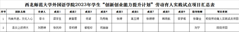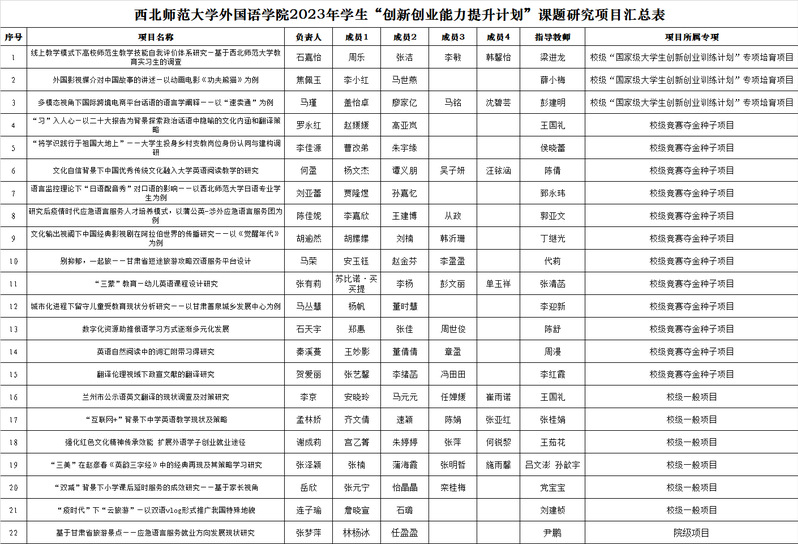 经过最终评审,确定推荐“线上教学模式下高校师范生教学技能自我评价体系研究—基于西北师范大学教育实习生的调查”等3个项目为校级“国家级大学生创新创业训练计划”专项培育项目,确定推荐“‘习’入人心—以二十大报告为背景探索政治话语中隐喻的文化内涵和翻译策略”等12个项目为校级竞赛夺金种子项目,确定推荐“兰州市公示语英文翻译的现状调查及对策研究”等6个项目为校级一般项目,确定推荐“与食共进,文化入心”1个项目为校级劳动育人实践试点项目,确定推荐“基于甘肃省旅游景点——应急语言服务就业方向发展现状研究”1个项目为院级课题研究项目,确定推荐“舌尖上的师大”1个项目为院级劳动育人实践试点项目。