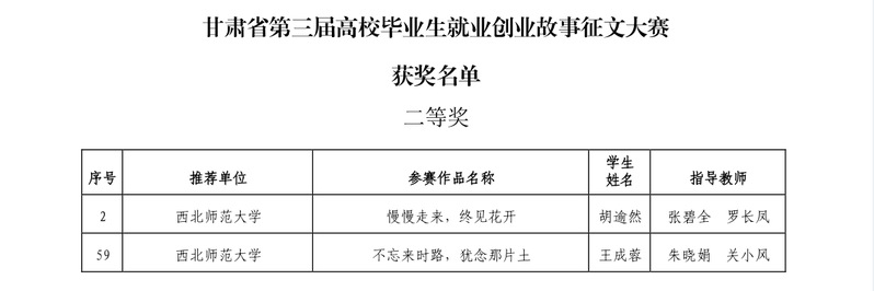2022年10月至2023年3月期间,由甘肃省教育厅主办,西北师范大学承办的以“书写青春篇章,激发奋进力量”为主题的甘肃省第三届高校毕业生就业创业故事征文大赛如期举办,yl6809永利动员2022届、2023届毕业生积极参与,经前期学院推荐,学校审核,2019级阿拉伯语班胡逾然作品“慢慢走来,终见花开”,2019级英语5班王成蓉作品“不忘来时路,犹念那片土”荣获省赛二等奖。