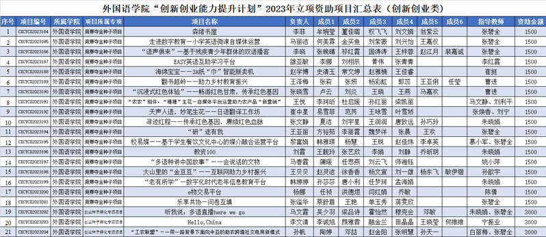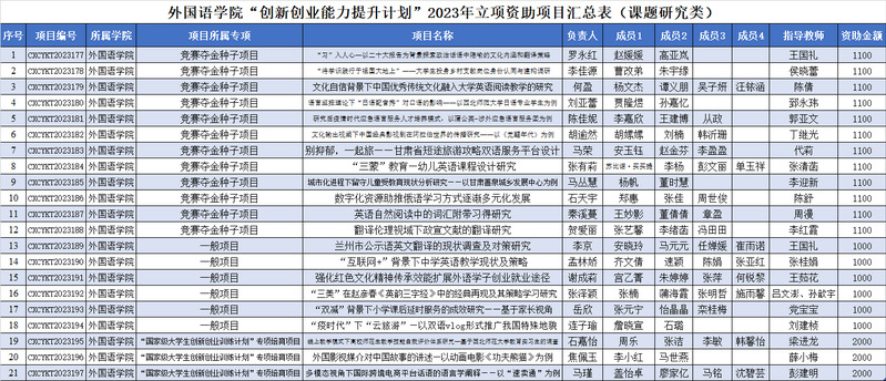 为进一步深化学校创新创业教育改革,推动创新创业教育与思想政治教育紧密结合、与专业教育深度融合,培养学生创新意识、创新思维,提高学生学术研究能力、创新创业能力,根据《西北师范大学学生“创新创业能力提升计划”实施办法(试行)》规定要求,学院积极组织师生参与申报,经学院评审答辩,推荐至学校评审,最终有43项项目在2023 年学生“创新创业能力提升计划”立项中成功立项,获得资助金额共计6.92万元。其中课题研究项目21项,资助金额2.52万元,创新创业项目21项,资助金额3.6万元,劳动育人试点项目1项,资助金额0.8万元。