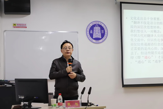 2023年3月24日下午,广西民族大学张旭教授应邀在致朴楼806室为我院师生作了题为“关于中国文化外译的若干思考”的学术讲座。讲座由院长高育松教授主持,本院师生70余人参加了本次讲座。