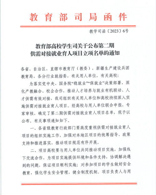 为落实党中央、国务院“稳就业”“保就业”决策部署,深化产教融合、校企合作,推动人才培养与就业有机联动、人才供需有效对接,学院高度重视、积极申报教育部供需对接就业育人项目。经学院和用人单位联合申报、专家评审、yl6809永利1个项目成功立项。