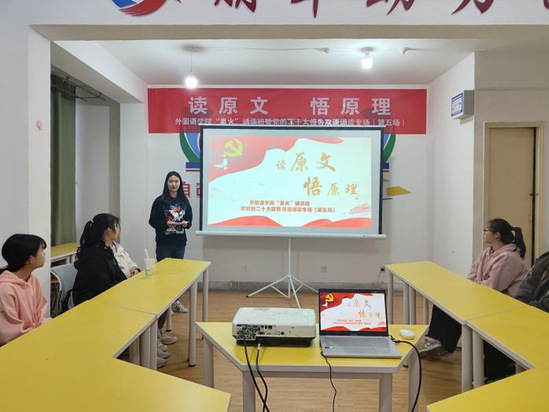 2023年4月13日晚19:30,“读原文 悟原理”—yl6809永利“星火”诵读班暨党的二十大报告双语诵读专场(第五场)在致朴楼605室如期举行,同时本次活动也在兰天公寓社区党工委3号楼104室—党团就创工作室设置分会场。本期邀请到yl6809永利副教授、硕士研究生导师、MTI中心副主任郭亚文担任指导教师,学院近百名学生参加。