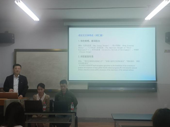 诵读活动在学院专职辅导员刘宁老师和曹亚婷老师的主持下开始。首先领读人2019级英语专业本科生汤锐艺和刘博对党的二十大报告选段进行了双语诵读,郭亚文老师从党的二十大报告中专用名词的翻译方法展开,进行了重点讲解,并由此引申,利用具体的实例,讲述了政论文文体中词汇互译的差别,让同学们感受到了翻译学的严谨和专业。