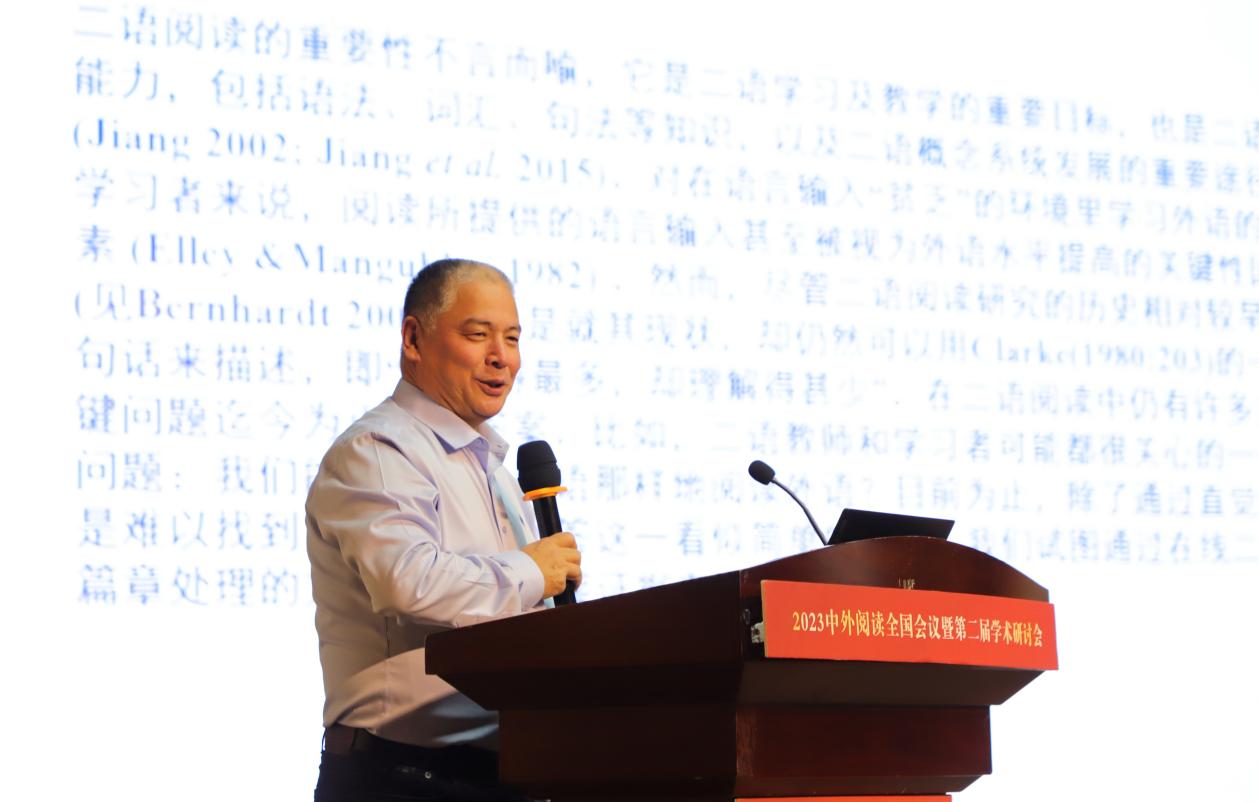 上海交通大学杨枫教授以“外语阅读与母语阅读心理加工机制的协同性”为题,通过在线二语篇章处理的方法,研究了母语阅读与二语阅读之间的关系,并提出二语阅读与母语阅读有同样的心理认知过程,且母语阅读能力会迁移到二语阅读当中。
