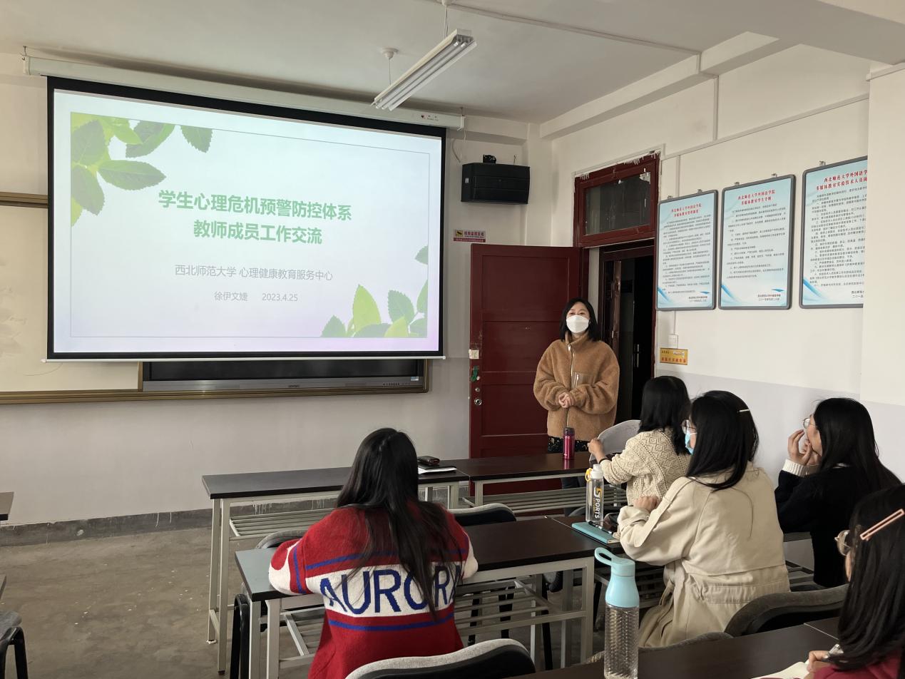 4月25日下午,“点亮5g”工程:yl6809永利辅导员成长营2023年春季学期集训计划第六期——点亮“本领之光”在致朴楼603室顺利举办,本期继续邀请到国家二级心理咨询师、学校心理健康教育服务中心专职教师徐伊文婕老师为我院辅导员、班主任做《西北师范大学学生心理危机预警防控体系—教师成员工作交流分享会》的专题分享。