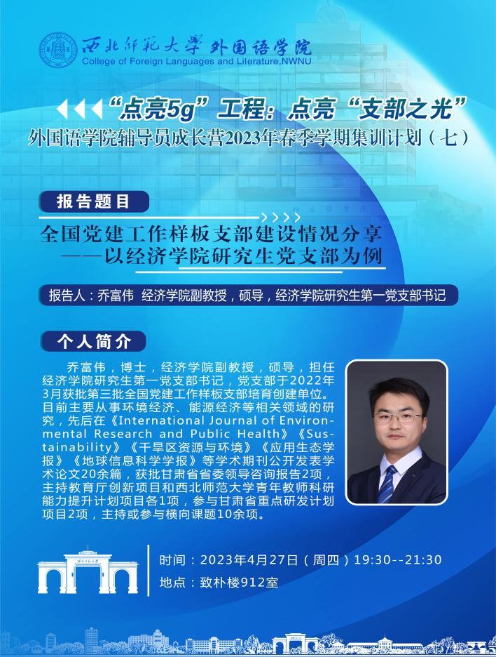 4月27日下午,“点亮5g”工程——yl6809永利辅导员成长营2023年春季学期集训计划——第七期以“线上+线下”的方式在新时代党员讲习中心顺利举办,本期邀请到经济学院副教授、硕士研究生导师,经济学院研究生第一党支部书记乔富伟老师做《全国党建工作样板支部建设情况分享——以经济学院研究生党支部为例》的分享。yl6809永利全体党支部书记、辅导员、学生党支部委员参加本期活动。