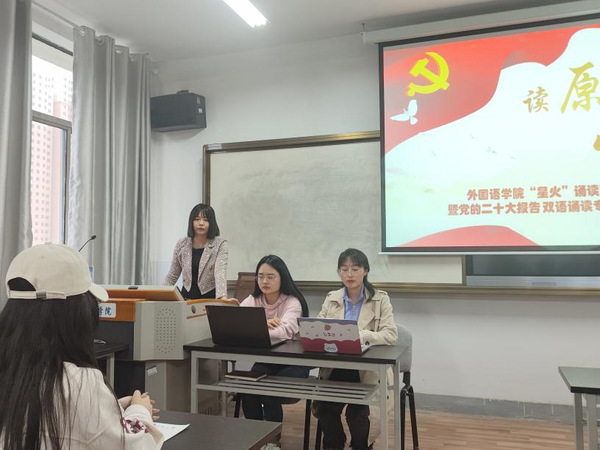 诵读活动在学院专职辅导员刘宁老师的主持下开始。首先两位领读人2020级和2021级俄语语言文学专业硕士研究生李瑶、文小清分别对党的二十大报告选段进行了双语诵读,李朝霞老师系统梳理了中俄关系发展的渊源历史,并以此为引,带领同学们学习了党的二十大报告中一些重点词句、语法的使用以及中俄双语互译中的差异,让同学们有机会从自身专业的角度学习领会党的二十大精神。