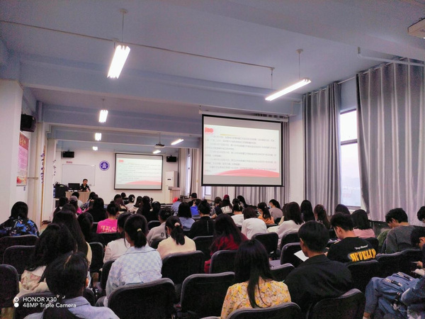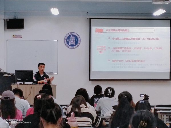 在讲座上,江老师结合中央民族工作会议精神对党的民族理论政策进行了宣讲。同时,江老师围绕铸牢中华民族共同体意识教育的内涵、传承及践行展开讲解并谈到:“铸牢中华民族共同体意识需要大家践行守望相助的理念,敢于担当,忠于奉献。”