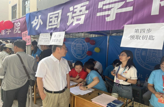 学院领导班子成员、新生班主任、研究生导师到现场关注报到实时情况,与新生和家长亲切交谈,让家长把孩子放心地交给学校,勉励新同学们尽快适应大学生活。
