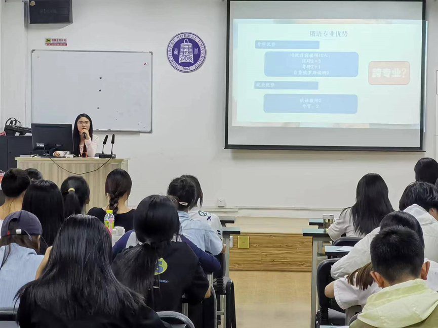 随后,外国语言学及应用语言学专业研二的刘思琳同学,以自己考研的亲身经历,跟同学们分享了考研的整个历程。刘思琳是我院俄语专业2022届的毕业生,在分享中,她用自己同班同学考研的数据,让参加推进会的全体学生对考研的目标锚定、专业选择、学校选择、自我定位等多个关键点有了清晰的认识。