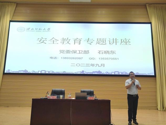 党委保卫部副部长石晓东通过生动的案例分享,总结了大学校园常见的安全问题,指出每位学生都是自己安全的第一责任人,引导同学们树立高度的安全意识,做到警于思、合于规,慎于行。