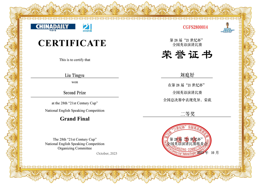 10月11日,第28届中国日报“21世纪杯”全国大学生英语演讲比赛决赛选拔于江苏省太仓市如约开展,在经过来自全国各大高校88名选手的激烈角逐后,我院2022级英语专业学生刘庭妤脱颖而出,荣获第28届中国日报“21世纪杯”全国大学生英语演讲比赛全国二等奖。