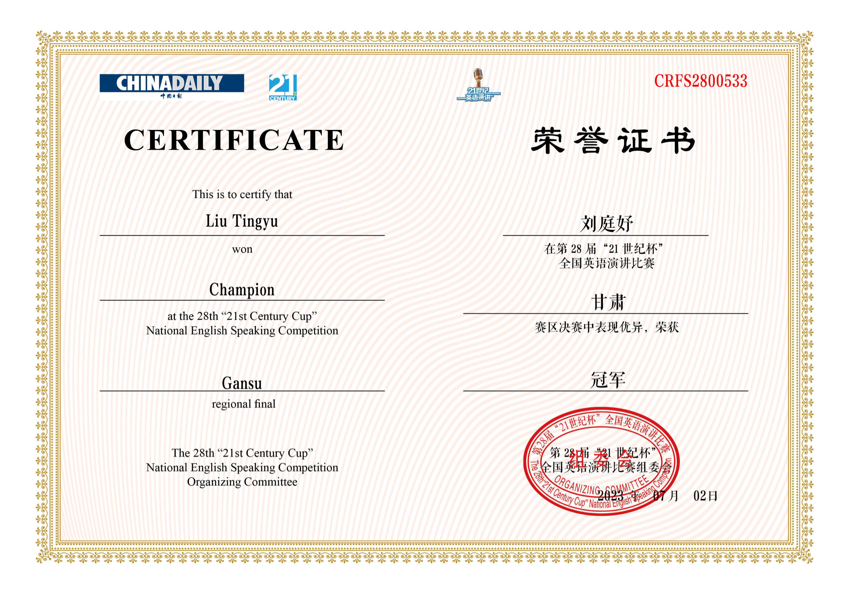在历时六个多月的比赛中,刘庭妤通过校赛和省赛的层层选拔,荣获甘肃省赛区决赛冠军,最终晋级全国决赛选拔阶段,荣获全国二等奖。
