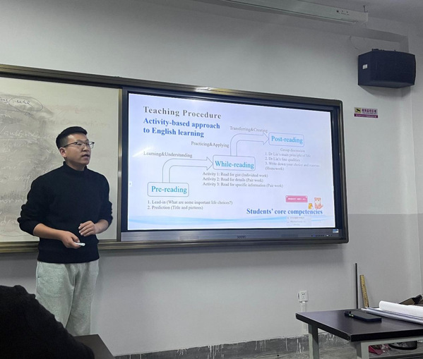 比赛由教案设计、说课和模拟授课三个环节构成。参赛选手结合自己的教学设计,在规定时间内呈现说课和模拟授课的内容。比赛过程中,选手们各展风采,紧扣新课标理念,通过片段教学,充分展现了自己的教学特色和扎实基本功。评委老师从教学设计思路、教学方法运用、教学语言、教态等维度进行评价,既肯定了选手们的精彩表现,又提出了中肯的意见和建议。