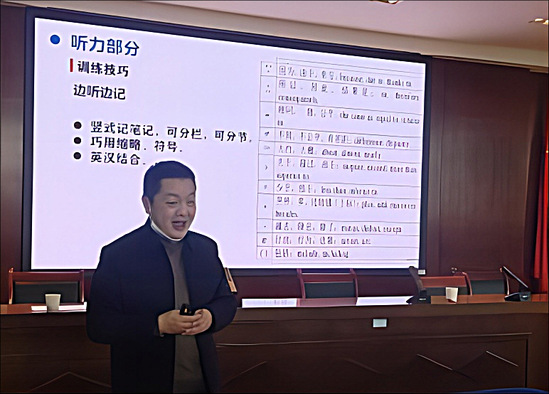 王朝一老师围绕《高中英语学习中的一些困惑及解决策略》的主题展开讲座,给大家分享了高中英语写作技能的训练技巧,以及命题作文和续写题型的解题策略。讲座深入浅出,充满了智慧和创新。李辉老师的讲座主题是《英语学习策略及应试技巧》,针对高中教材听力材料的开发、考试题型的解题策略进行了详细的阐述,结合老师们教学中存在的问题提出了独到的见解和行之有效的教学方法。