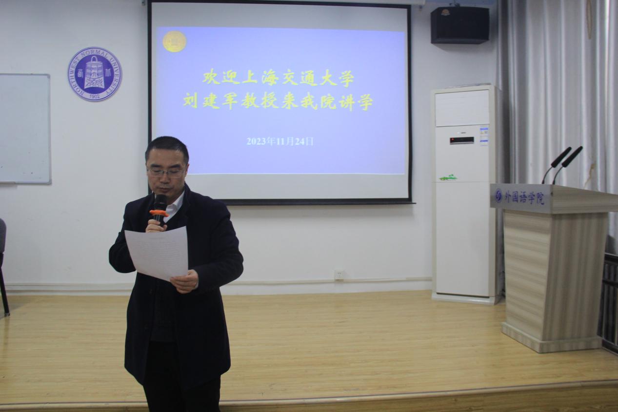 11月24日上午,上海交通大学特聘教授、博士生导师刘建军教授,应邀在致朴楼806室为我院师生做了题为“外国文学研究的意义”的学术讲座。本次讲座由院长高育松教授主持,我院百余名师生聆听了讲座。