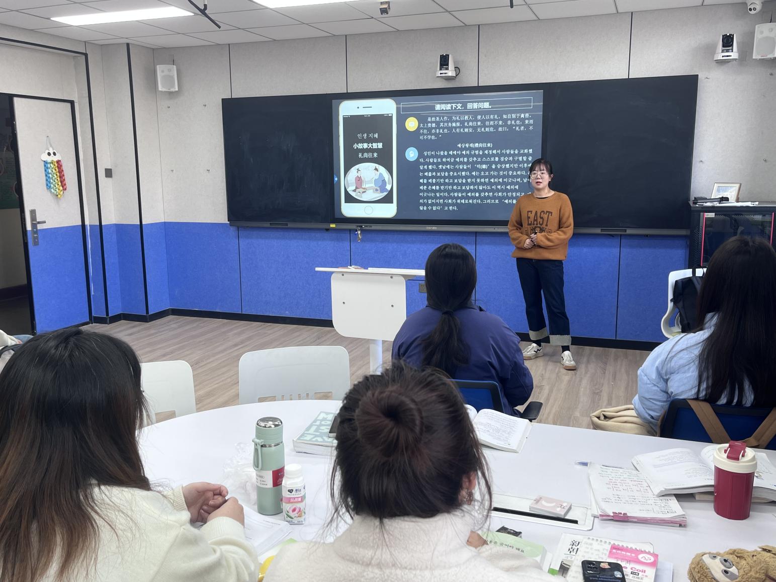11月7日,朝鲜语系教师观摩了董宵朦老师的课堂。董老师通过“礼尚往来”的故事,介绍了中国与韩国的送礼文化。引导学生通过了解不同国家的送礼风俗与禁忌,思考各个国家的文化差异。课堂中,学生之间、学生与老师之间畅所欲言,营造了浓厚的学习氛围。