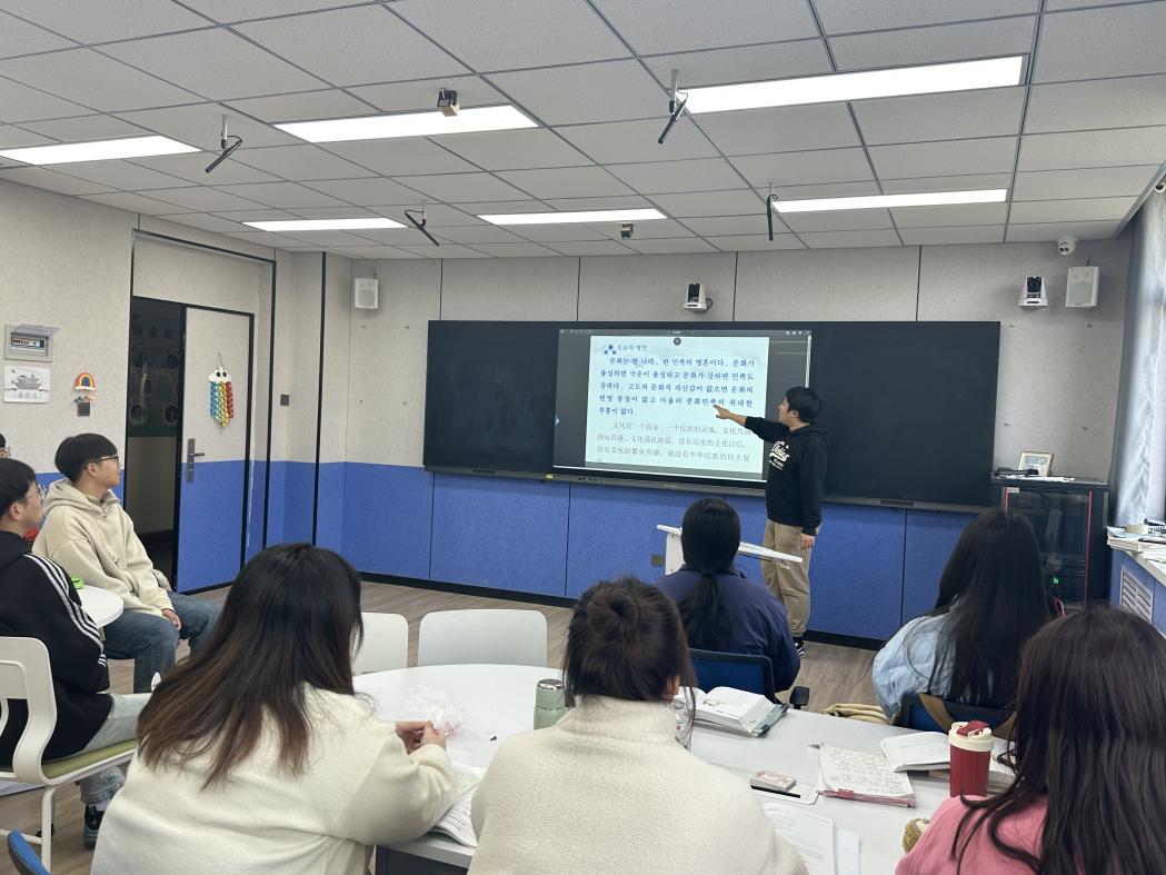 11月14日,朝鲜语系教师观摩了张耀公老师的课堂。张老师在“金句阅读翻译”环节,选取了“文化是一个国家、一个民族的灵魂。文化兴国运兴,文化强民族强。没有高度的文化自信,没有文化的繁荣兴盛,就没有中华民族伟大复兴”,进行了翻译讲解,要求学生准确理解语句、分析翻译策略,并组织学生探讨了文化自信与中华民族伟大复兴之间的关系。学生们积极发言,同时论及到文化安全等话题。通过本堂课,学生们对文化自信有了更深一层的理解。