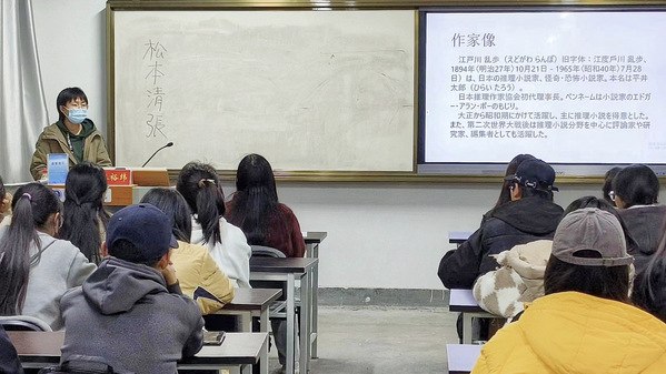 秦裕纬老师以作者画像为线,详细引入了书籍写作背景和日本不同时期的文学特色,带领学生清晰了解《怪盗二十面相》,也让同学们感受到日本文学的独特之处。在分享中,秦老师还穿插对日语的学习,深刻讲解了日本语言特色。最后,同学们就日语学习和日本侦探小说阅读向秦老师提出问题,秦老师逐一解答并肯定了同学们的好学精神。