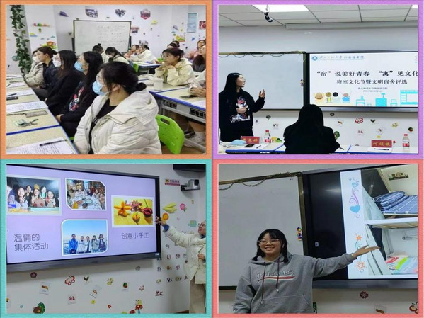 寝室文化月活动开展以来,全院学生积极参与,各宿舍成员共同商讨、精心设计制定了清晰美观、可行性强、展现宿舍特色的“室”言公约,促进了舍友间的有效沟通,培养了同学们的自我管理意识;舍友间互相配合,将宿舍废旧物品进行改造,制作出“电视机”“作息牌”、抽纸盒等多种多样精巧的手工作品,不仅加强了学生对环保的认知,还提高了动手能力,将劳动教育持续落实落深;宿舍成员积极发挥主观能动性,对宿舍进行卫生清洁和装饰,通过铺设地板革、育养绿植、制作宿舍卫生值日表、宿舍照片墙等提升了学生公寓生活的幸福感;在“兰天一日展”寝室文化活动中,通过“你比我猜”宿舍默契大挑战游戏吸引了现场同学的热情参与,同学们真切感受到了建设良好宿舍环境的重要性。