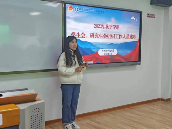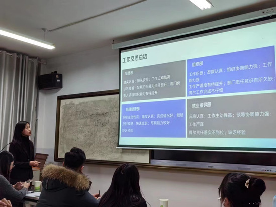 本科生和研究生学生组织主席团成员及部门负责人围绕政治引领、道德品行、学习情况、工作成效、纪律作风等方面进行汇报,在对所负责的部门工作进行全面总结的同时实事求是地分析工作中的优点与不足并提出改进办法,展望未来。述职结束后,评议组成员对参与述职的学生组织成员进行了现场评议,学院党委副书记安燕对同学们在学院学生工作中的付出表示感谢,希望同学们能够扬长避短,在来年的工作中不断改进。