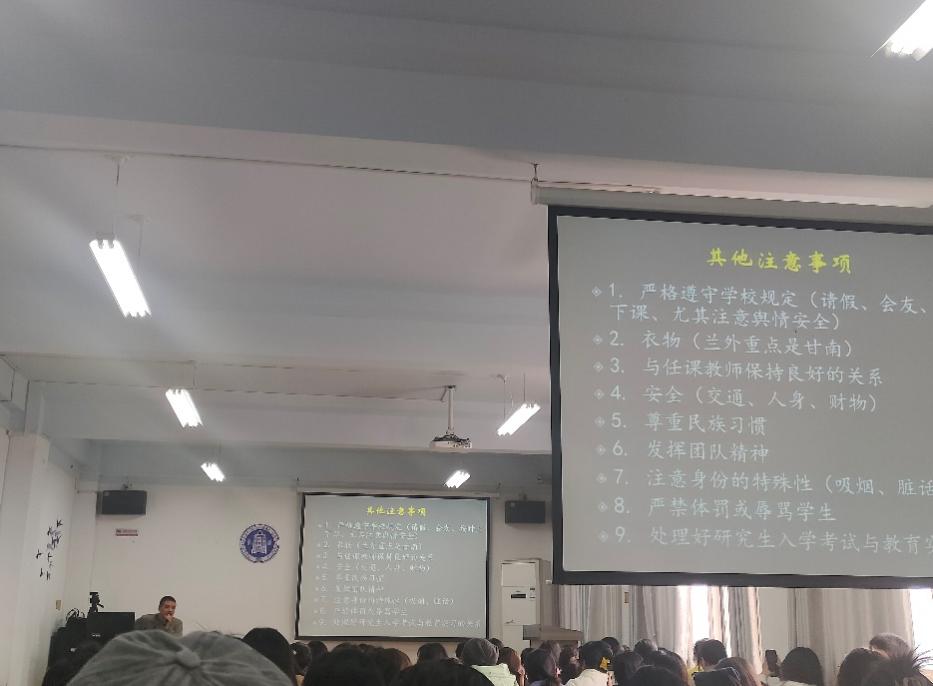 首先,梁海英老师提出教育实习有8个学分,同学们要写好教案、充分备好每一堂课、及时录课。同时,及时完成老师在雨课堂发布的任务。接下来,王国礼老师针对实习提出了一些注意事项。同学们要注意保持良好的师德师风,充分扮演好老师的角色,与同学们保持适当的距离;及时备课,设计好每一堂课,写好每一份教案;上课时要注意自己的声音大小、书写。生活中,同学们要严格遵守学校规定,尊重民族习惯,发挥团队精神,注意自己的身份等。针对同学们的安全问题,张碧全老师希望同学们在实习过程中不要忘记学习,为考研做好准备,也要及时关注学校推送的招聘信息。