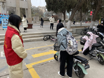 暖心引导,规范出行。学院组织学生党员在学院楼下、兰天公寓等人流密集的场所,引导学生人车分流、有序出入、按序充电,并提醒同学们规范停放自行车、电动车,共同维护安全舒适的校园环境。