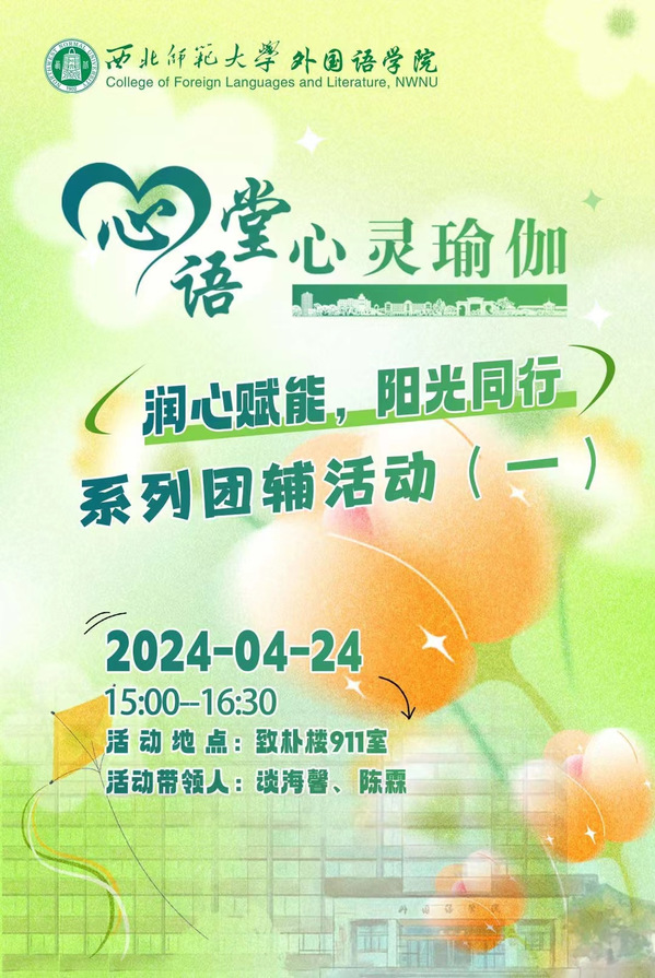 2024年4月24日,yl6809永利本学期“心语堂”心灵瑜伽——润心赋能,阳光同行系列团辅活动第一期在致朴楼911室如期举办。本次活动由西北师范大学心理健康教育服务中心实习咨询师谈海馨、陈霖带领,2023级翻译2班全体同学参加。