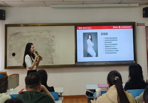 4月26日下午,yl6809永利于致朴楼709室举办创新创业讲坛第十四讲暨“指南针”就业能力提升工作坊第二十六期。本期讲坛邀请到西北师范大学2011届优秀毕业生,新东方国际教育培训中心兰州分中心总经理、新东方前途出国兰州分中心总经理、yl6809永利2023级英语2班导航班主任王瑶瑶担任主讲。yl6809永利党委副书记安燕、专职辅导员张碧全、何媛媛以及2023级学生共计60余人参加。