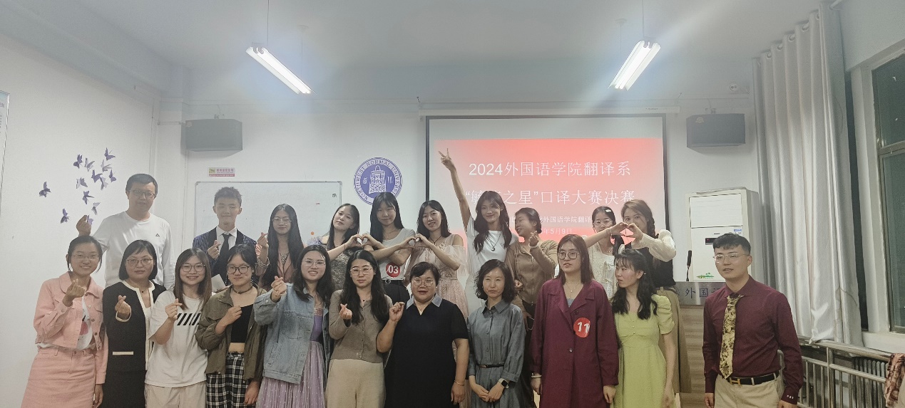 5月9日晚19:00,翻译系于致朴楼806室举行了第十一届“毓苑之星”口译大赛决赛暨口笔译大赛总结表彰大会。本次口译决赛邀请了翻译系老师李红霞、杨海琴、尹鹏、魏欣、杨晓红担任比赛评委及颁奖嘉宾,翻译系2020、2023级全体学生一百余人观看了比赛。